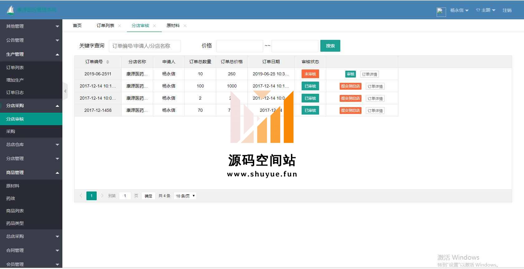 分店销售:销售统计图、订单批发审核、订单列表、分店销售;