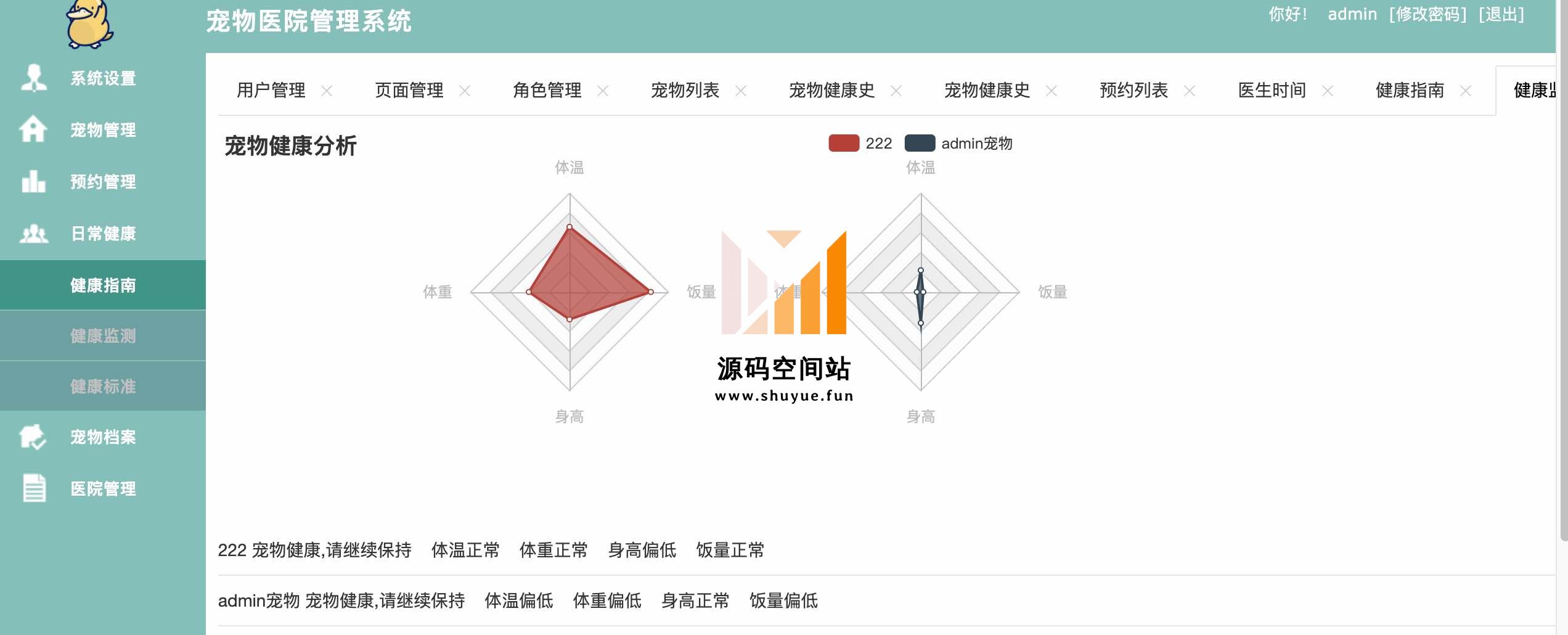 管理员登录,用户信息管理,页面菜单管理,角色管理,宠物信息管理,宠物治疗记录管理,预约管理,查看健康指南,查看医生预约时间,查看宠物健康分析表,查看预约数量统计,宠物日志管理,查看宠物日志图表,发布指南,标准制定管理,指南列表管理等功能。