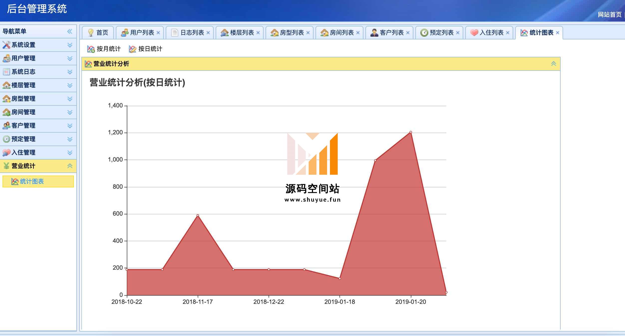 楼层管理、房型管理、房间管理、客户管理、预定订单管理、入住管理等功能。