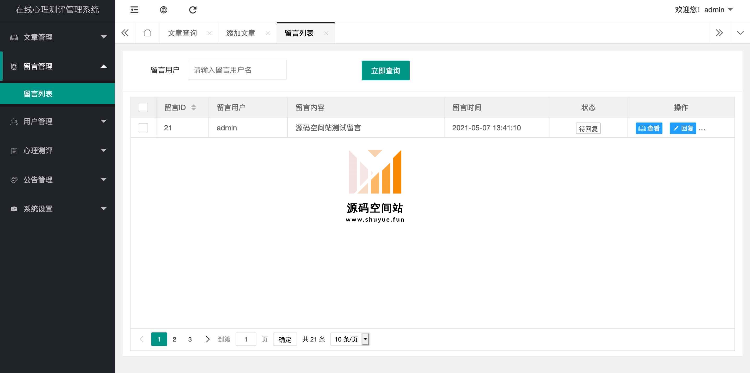 前台主要功能包括:首页、文章、心理评测、留言、公告等;