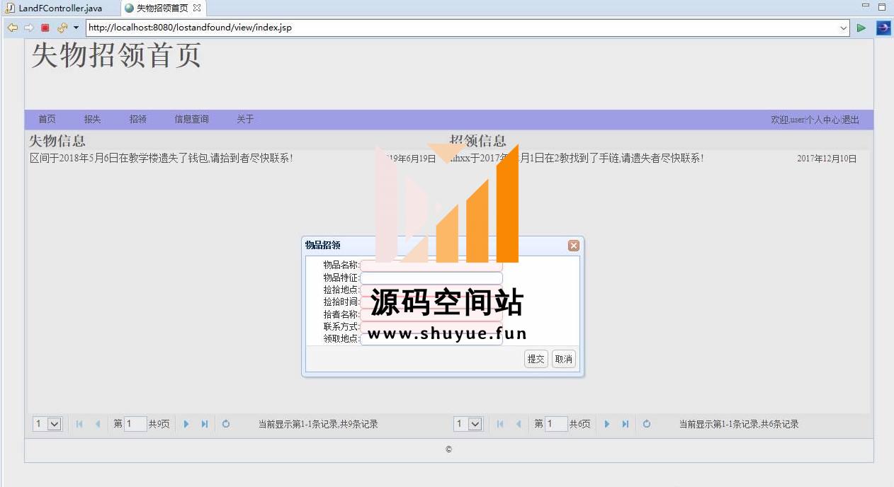 用户发布失物,或者招领失物,管理员对用户,失物信息进行增删改查。更多项目源码,请到“源码空间站”,地址:http://www.shuyue.fun/