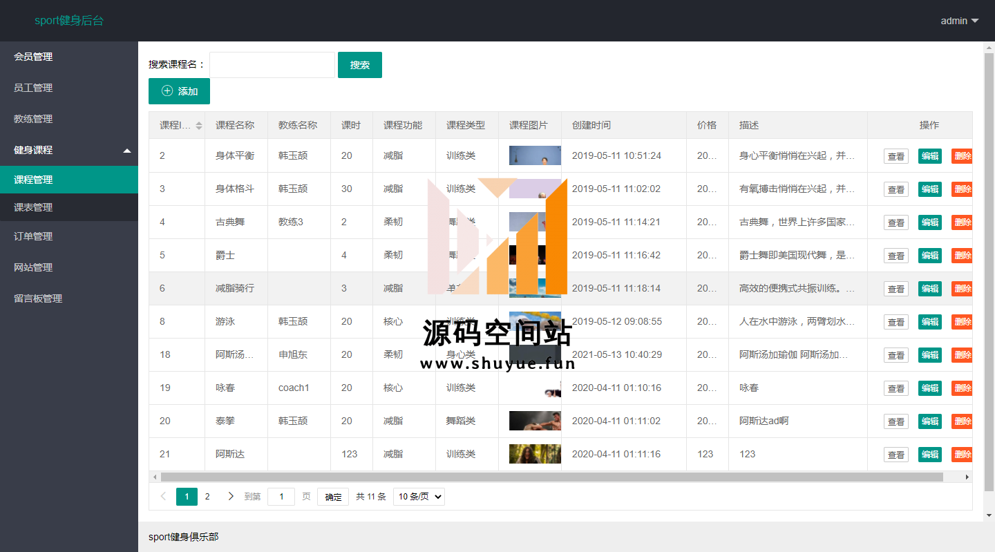 登录,会员管理-增删改查,员工管理-增删改查,课程管理,网站新闻管理,新闻添加编辑,留言管理等功能。更多项目源码,请到“源码空间站”,地址:http://www.shuyue.fun/