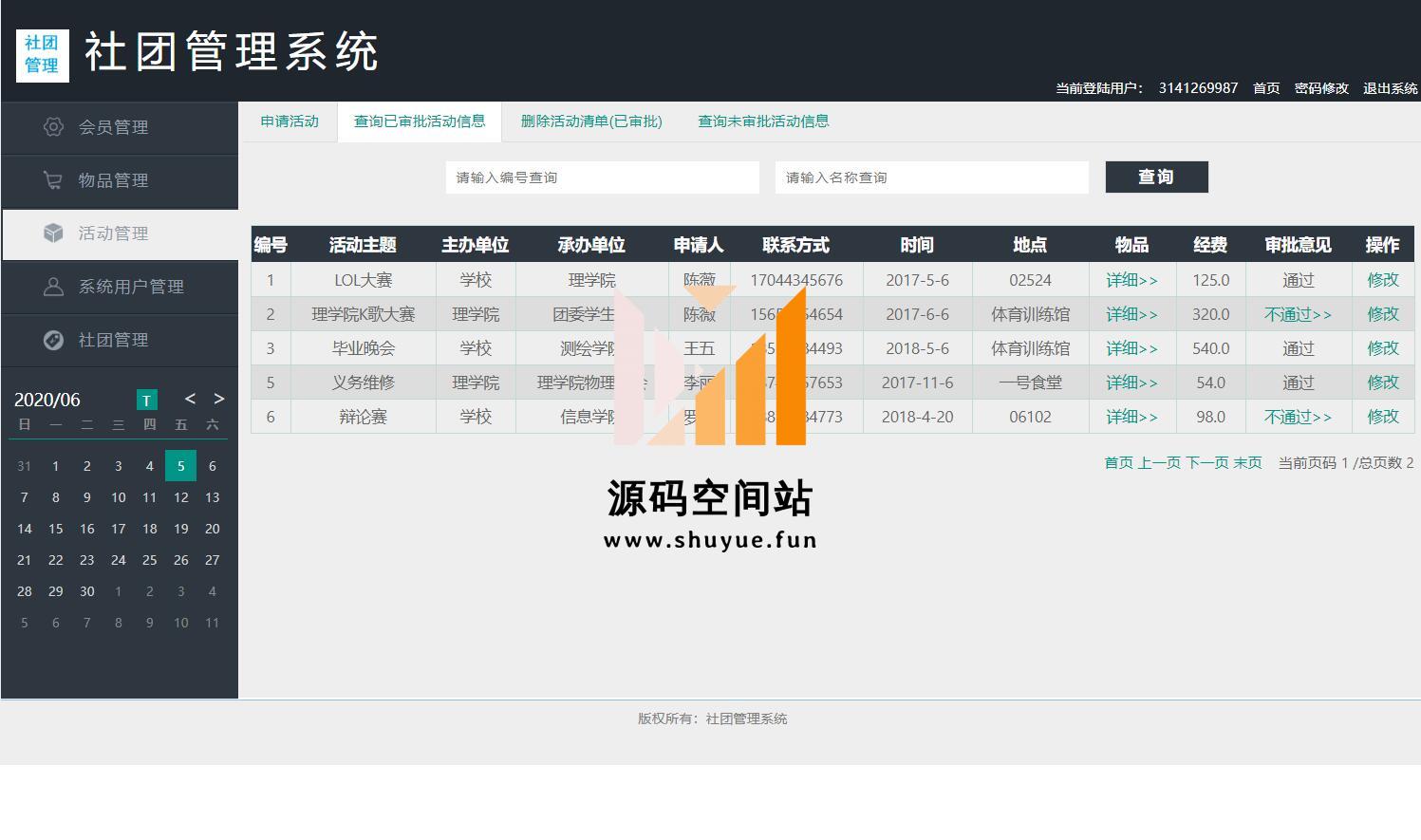 会员管理,物品管理,活动审批,系统用户管理,社团添加删除等功能。更多项目源码,请到“源码空间站”,地址:http://www.shuyue.fun/