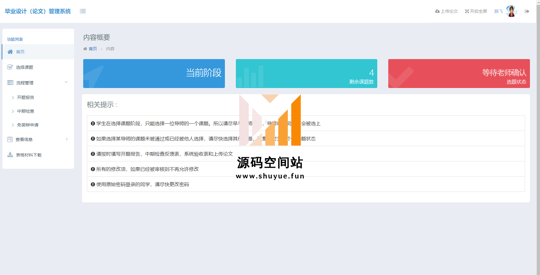 查看通知公告,登录,登录后学生主页面,选择课题,选择课题后状态为等待老师去人状态,填写开题报告,提交中期检查,提交免答辩申请,上传论文等功能。教师角色登录,教师首页,申报课题,审批学生选题,审核开题报告,审核中期检查,初审免答辩申请,审核论文是否过关,综合打分等功能。