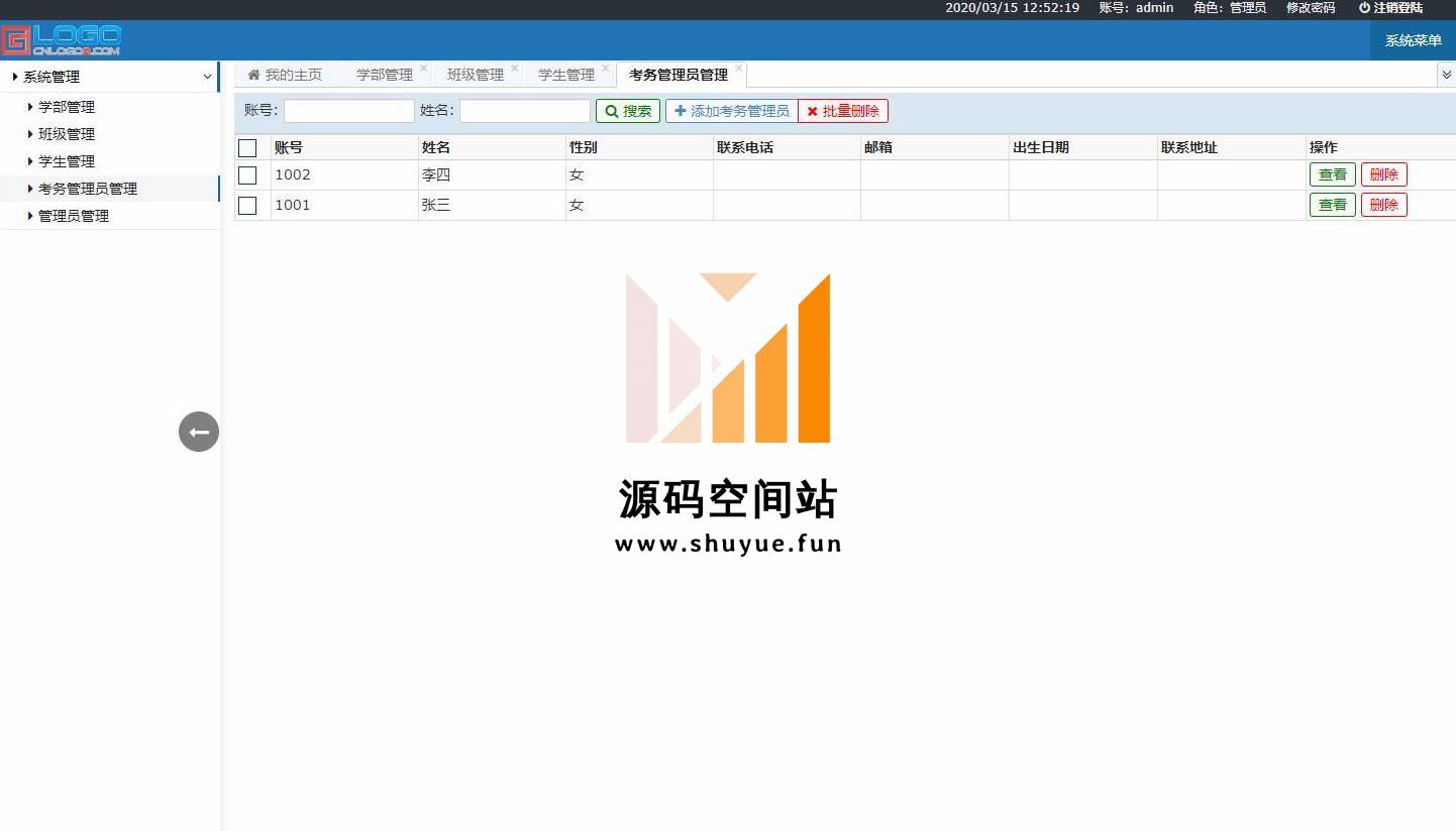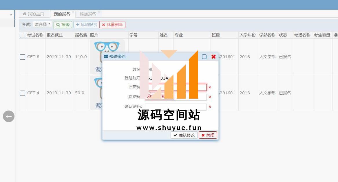 考务管理员登录,教务办公室管理,考场管理,考试管理,考场分配管理,报名管理等功能。更多项目源码,请到“源码空间站”,地址:http://www.shuyue.fun/
