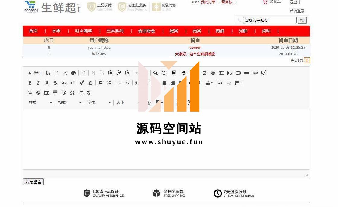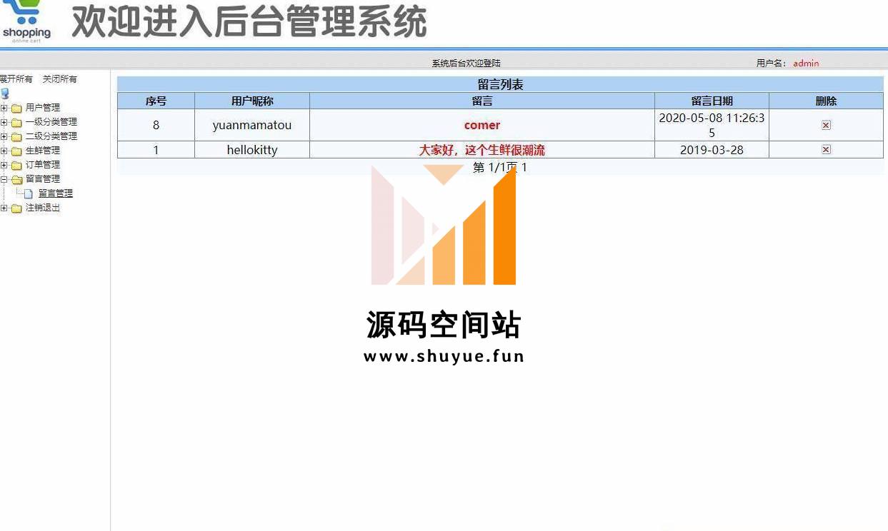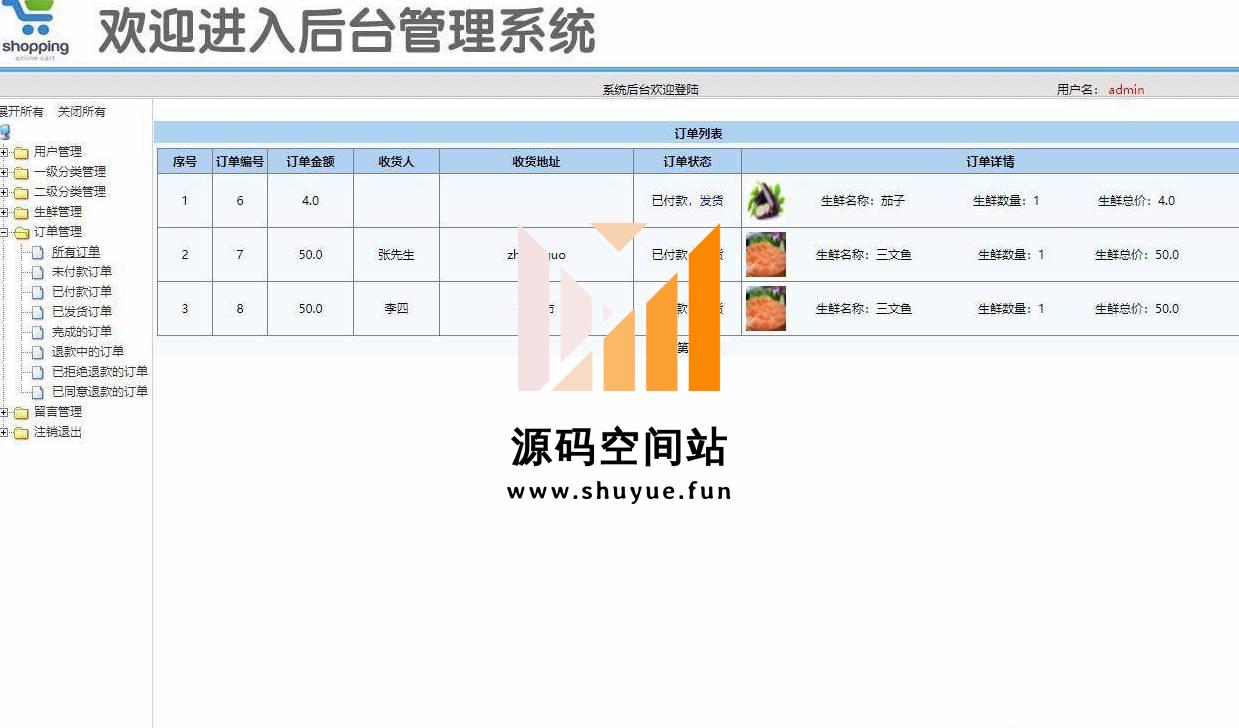 管理员登录,用户管理,生鲜分类管理,生鲜商品管理,订单管理,用户留言管理等功能。演示视频:点此查看