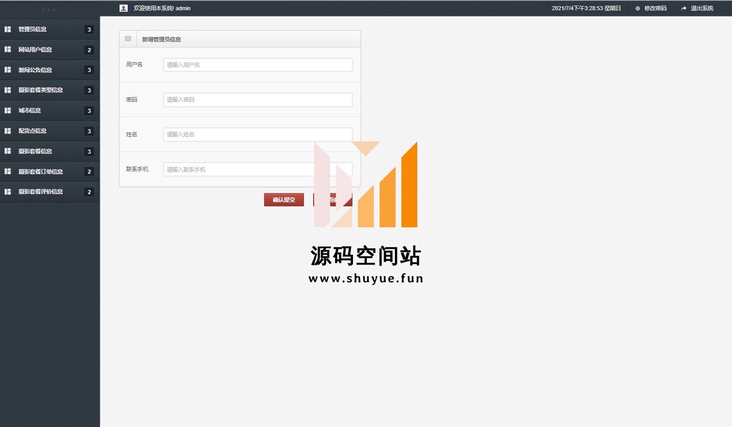 管理员登录,管理员信息管理,用户信息管理,新闻公告管理,套餐类型信息管理,城市信息管理,摄影基地信息管理,套餐信息管理,订单信息管理,查看评价信息等功能。按分类查看,用户登录,查看商品详情,加入购物车,提交订单,查看订单,修改个人信息,查看网站公告,查看摄影基地等功能。