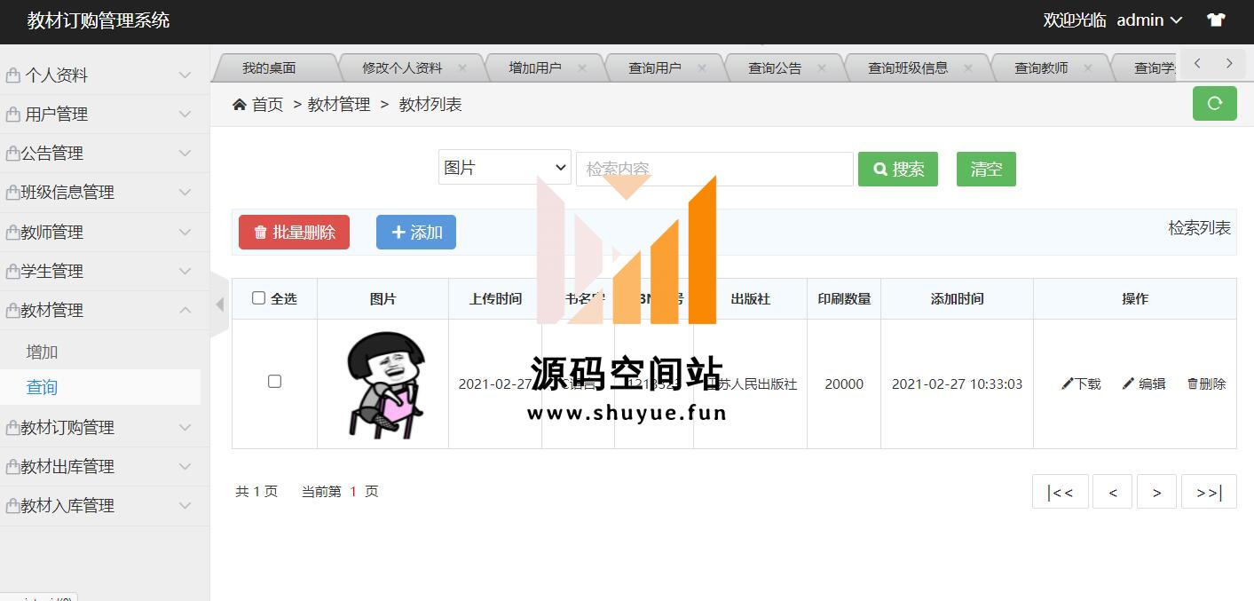 管理员登录,个人资料管理,用户管理,公告管理,班级信息管理,教师管理,学生管理,教材管理,教材订购管理,教材出库管理,教材入库管理等功能。更多项目源码,请到“源码空间站”,地址:http://www.shuyue.fun/
