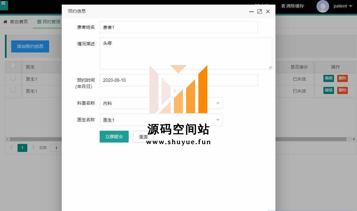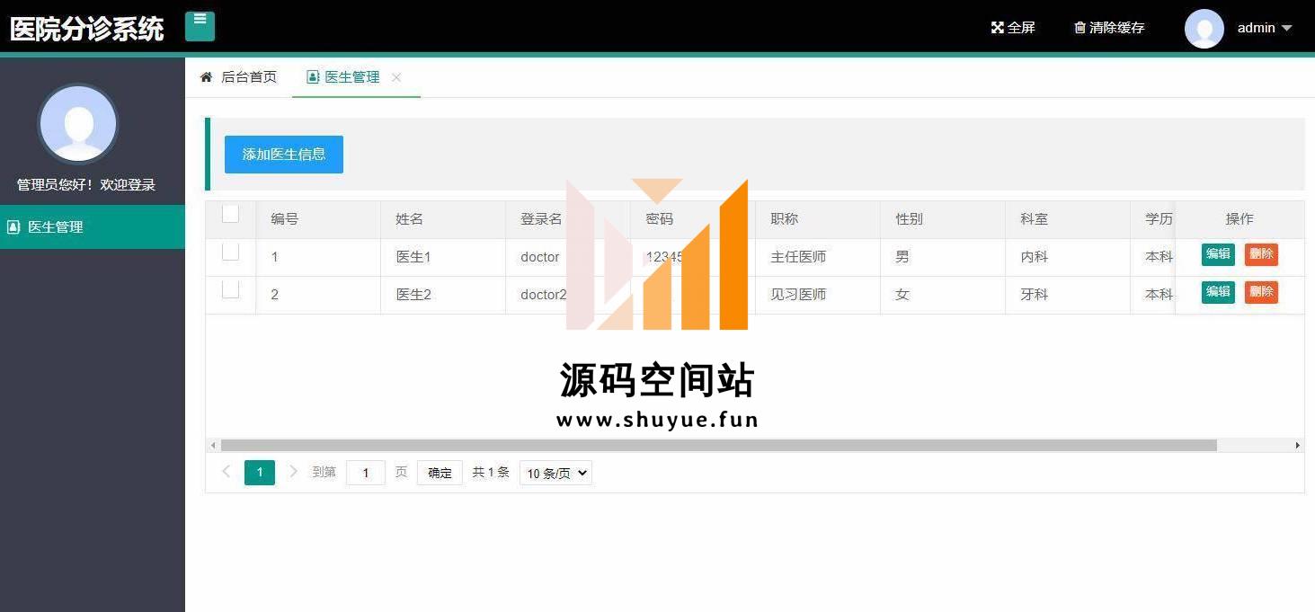 管理员登录,医生管理等功能。更多项目源码,请到“源码空间站”,地址:http://www.shuyue.fun/