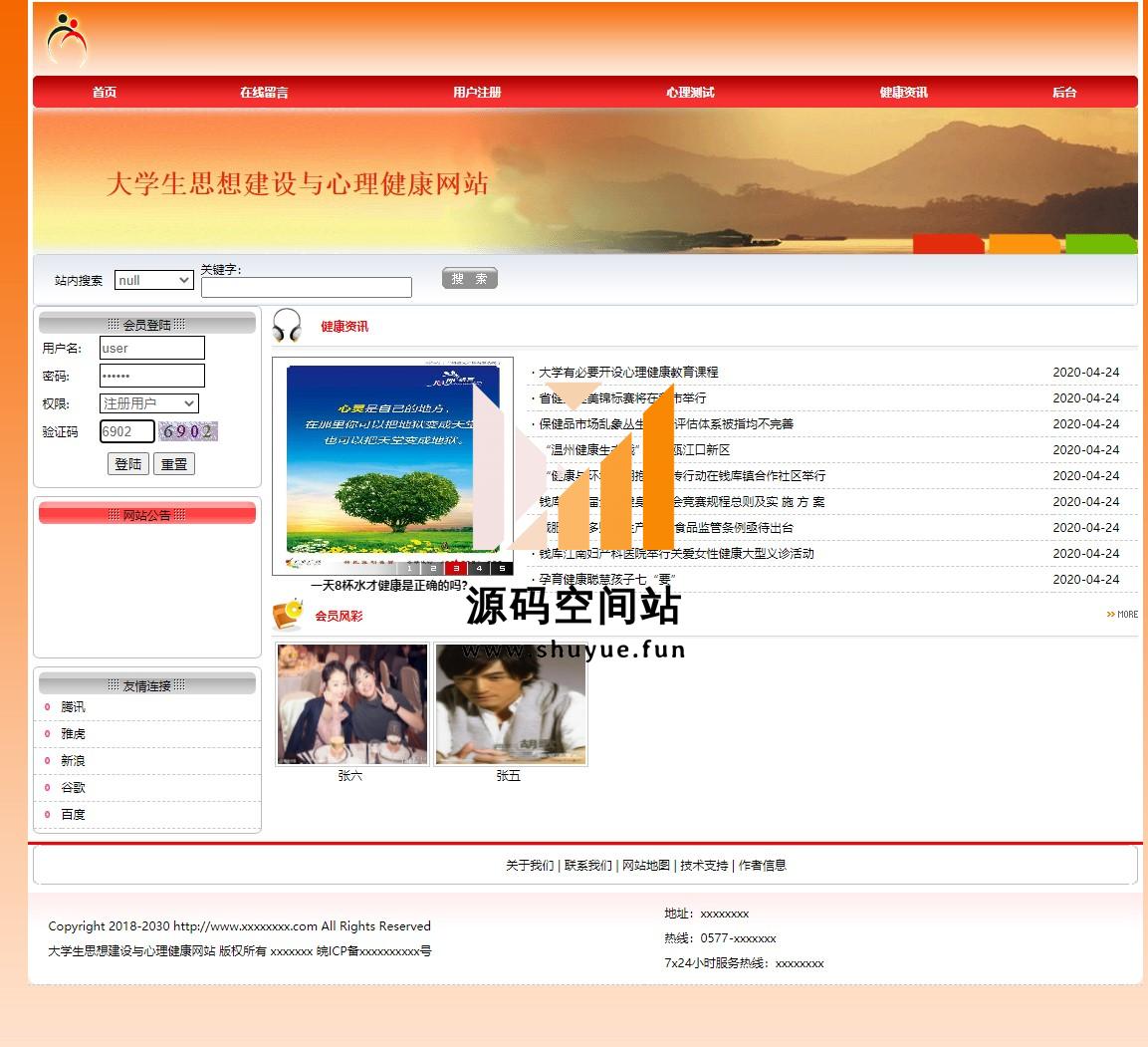 学生登录注册首页,在线留言,健康资讯查看,心理测试,个人信息管理,心理测试成绩查看,留言查询等功能。教师角色登录,个人资料管理,留言查看等功能。