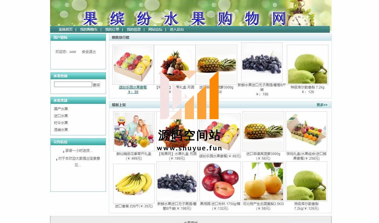 管理员登录,修改密码,类别管理,水果管理,订单管理,网站论坛管理,网站公告管理等功能。查看首页,查看水果详情,加入购物车,提交订单,修改个人信息,查看并提交留言,查看我的订单等功能。