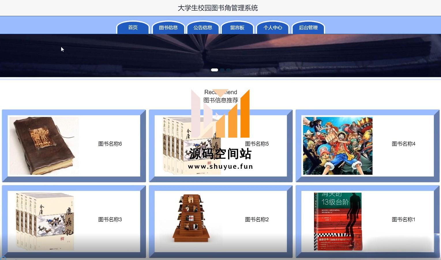 管理员登录进入大学生校园图书角管理系统可以查看主页,个人中心,用户管理,图书信息管理,图书分类管理,图书购买管理,图书借阅管理,图书续借管理,图书归还管理,留言板管理,系统管理等功能