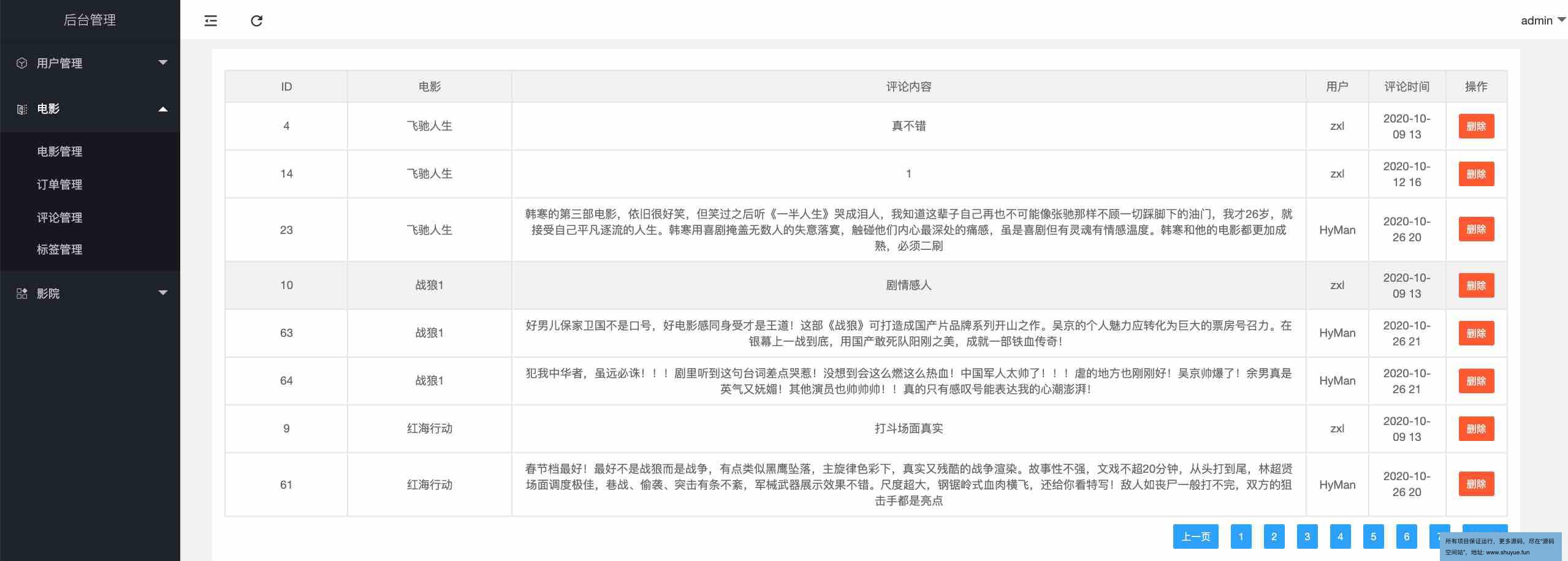 用户管理、电影管理、订单管理、评论管理、标签管理、放映厅管理、场次安排等功能。