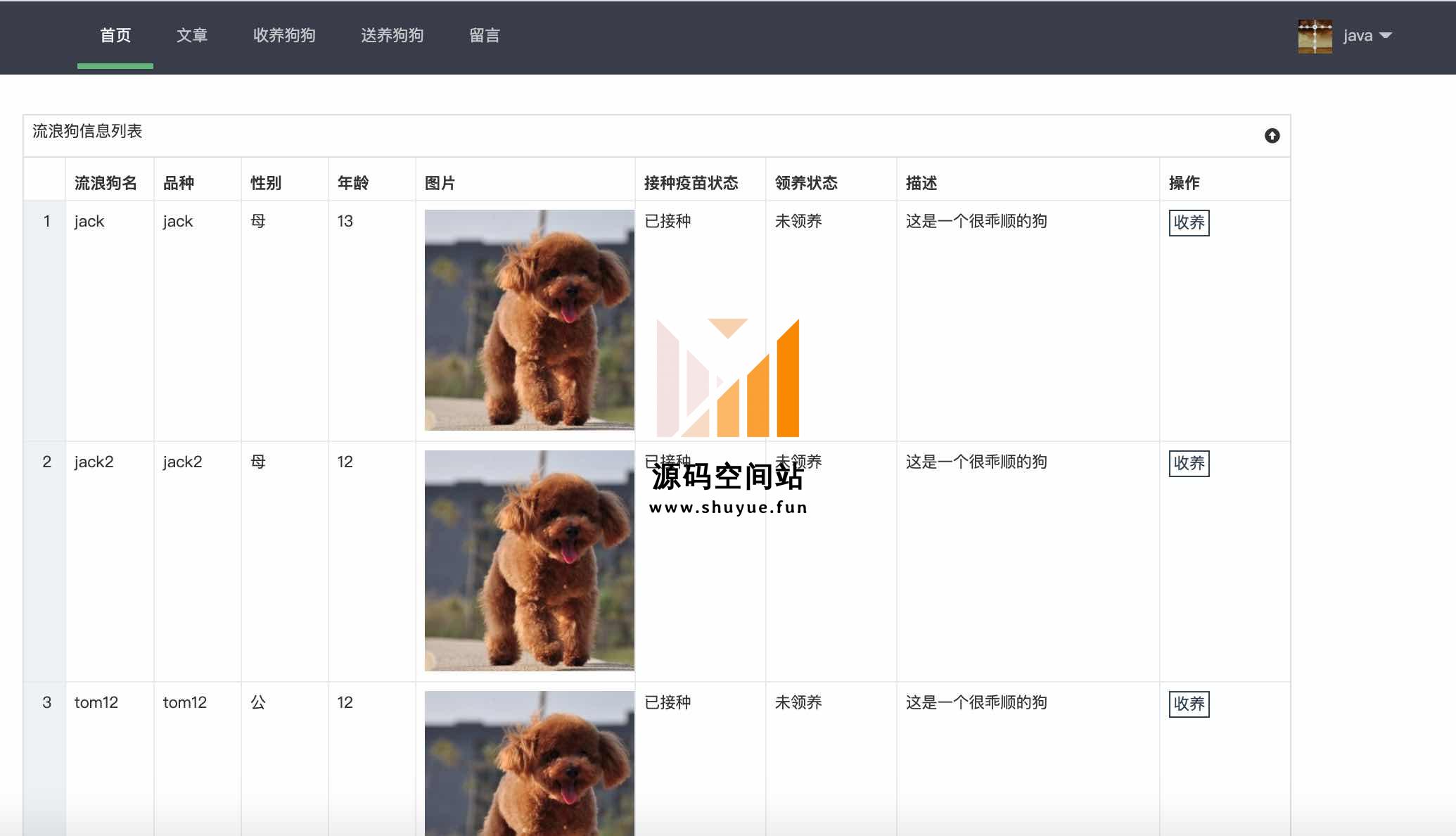用户信息、流浪狗信息、疫苗管理、收养记录、客服管理等;