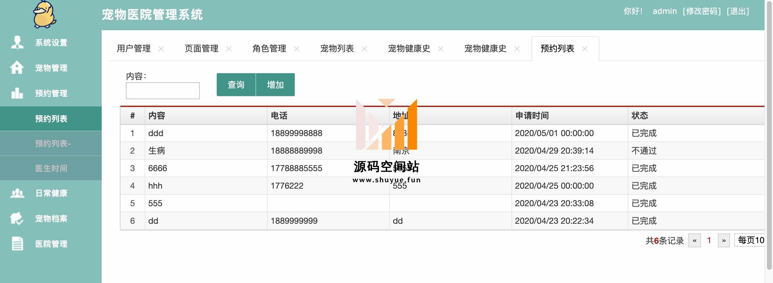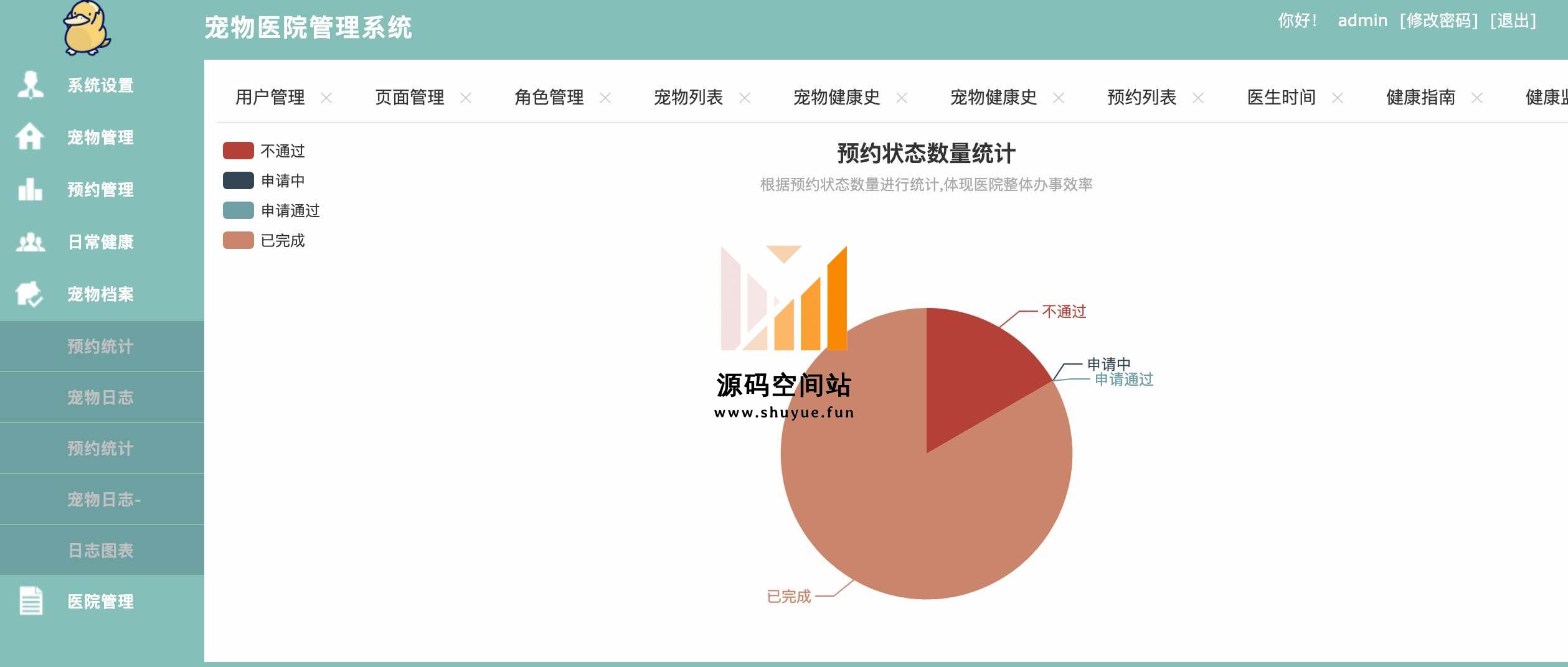 管理员登录,用户信息管理,页面菜单管理,角色管理,宠物信息管理,宠物治疗记录管理,预约管理,查看健康指南,查看医生预约时间,查看宠物健康分析表,查看预约数量统计,宠物日志管理,查看宠物日志图表,发布指南,标准制定管理,指南列表管理等功能。
