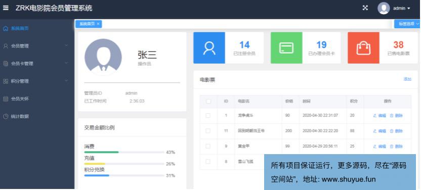 cinema项目是一套电影院会员管理系统,使用前后端分离架构开发,前端基于Vue.js+Element UI技术,后端使用springboot+mybatis实现,包含管理员、会员管理、会员卡管理、电影票、消费记录、数据统计等模块