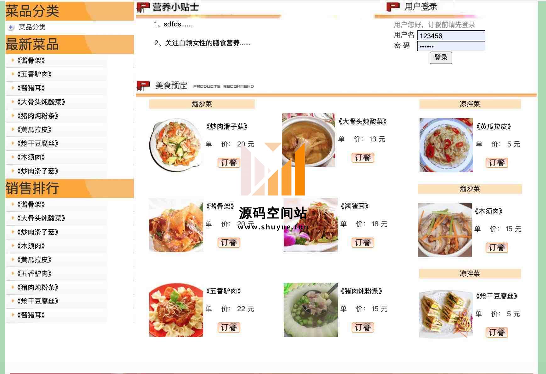 后台主要提供给管理员,主要功能有菜品管理、菜品类别管理、营养小贴士管理、会员管理、员工管理、留言管理、采购管理、销售订单查询、统计管理、用户管理等;
