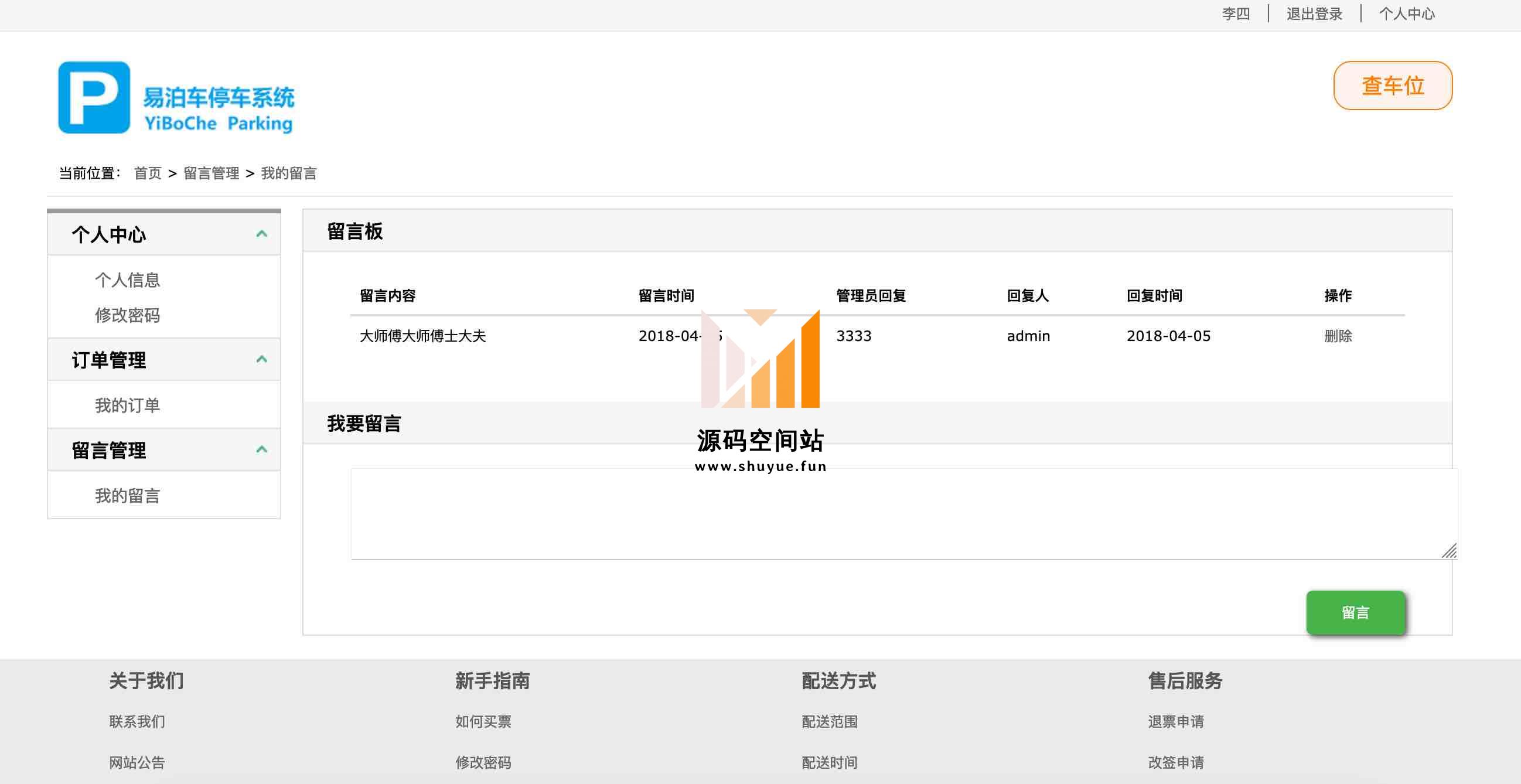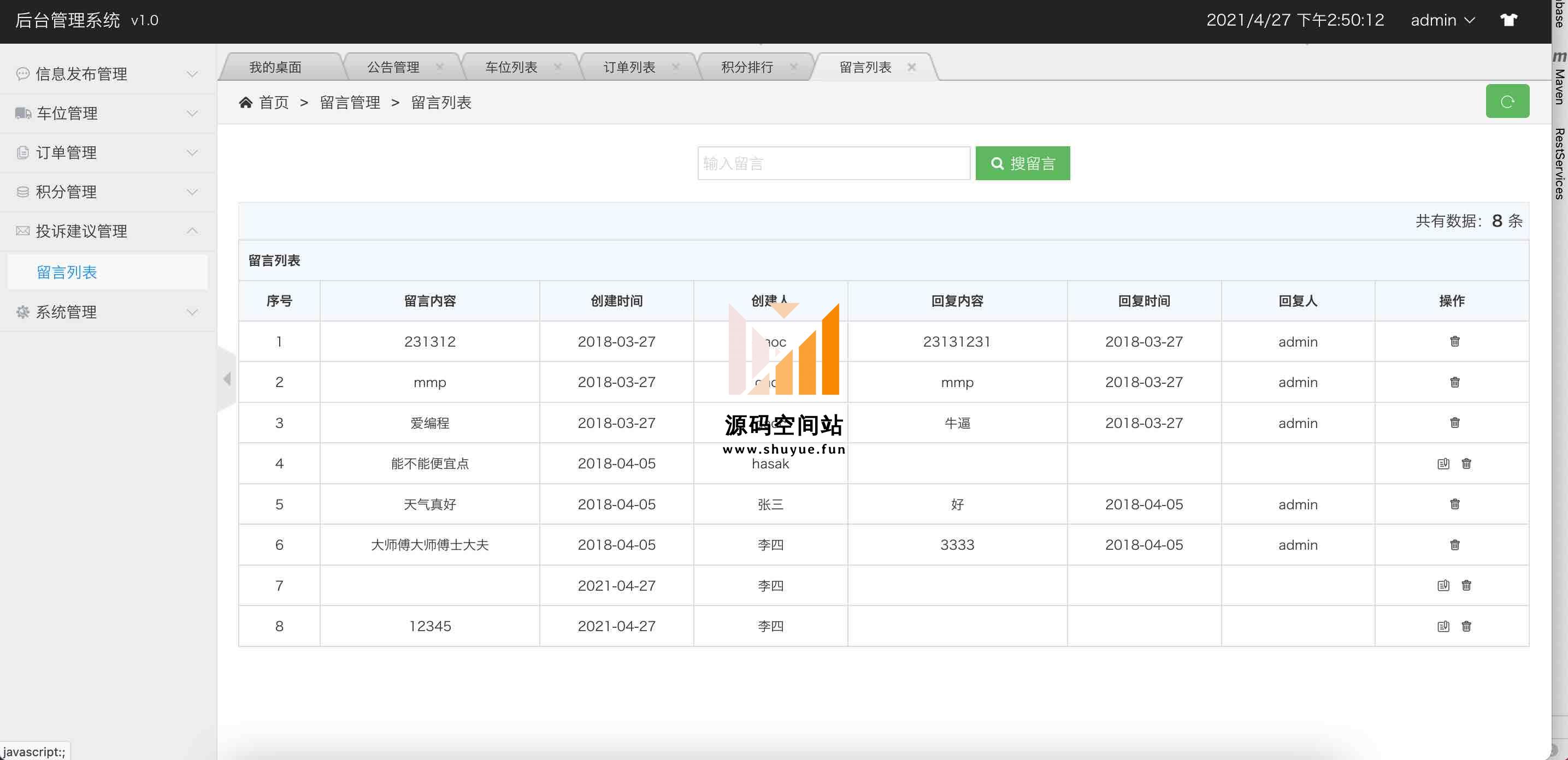 主要功能说明:公告管理,用户管理,留言列表,积分管理,管理员登录,管理员管理,订单管理,车位管理;