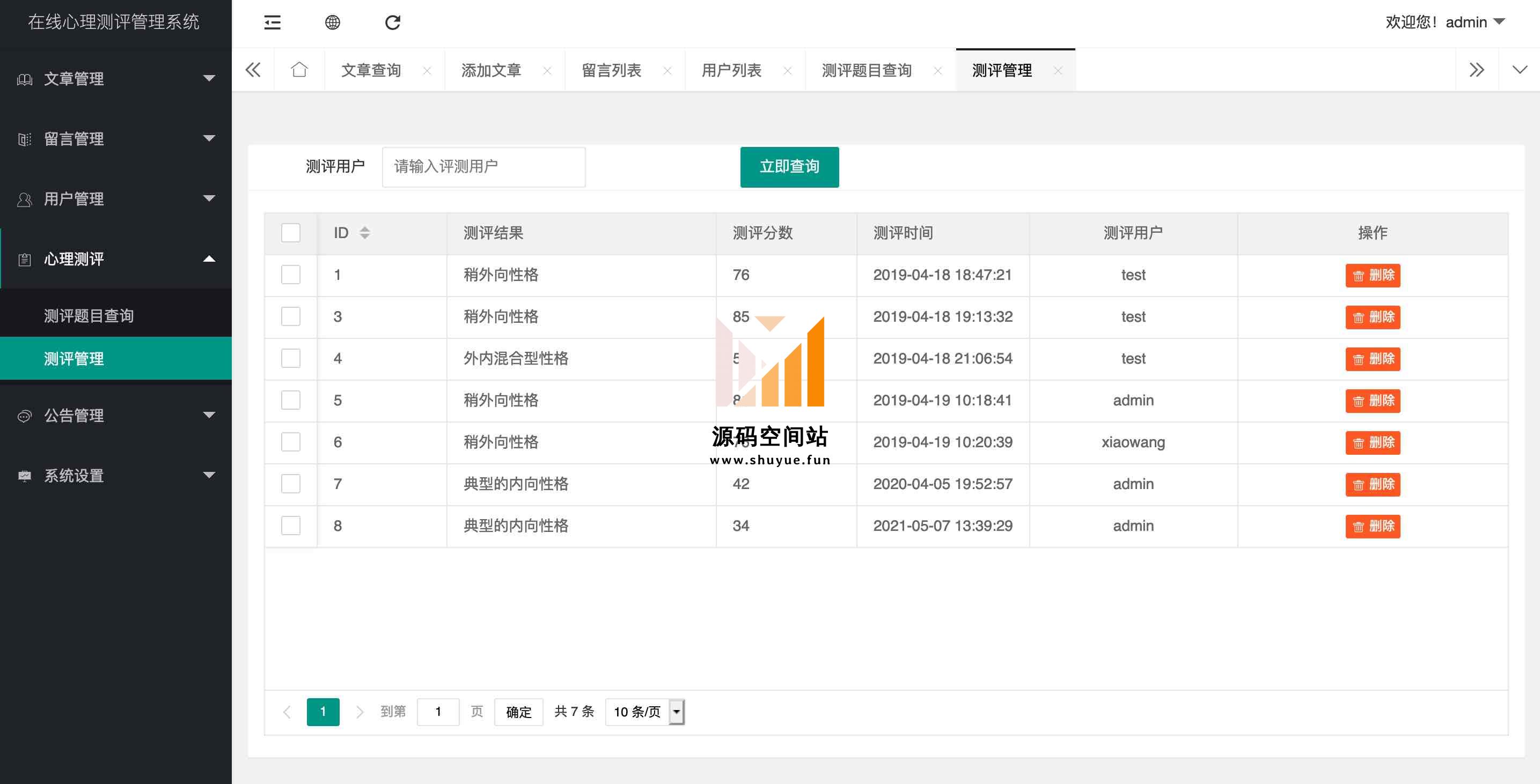 前台主要功能包括:首页、文章、心理评测、留言、公告等;