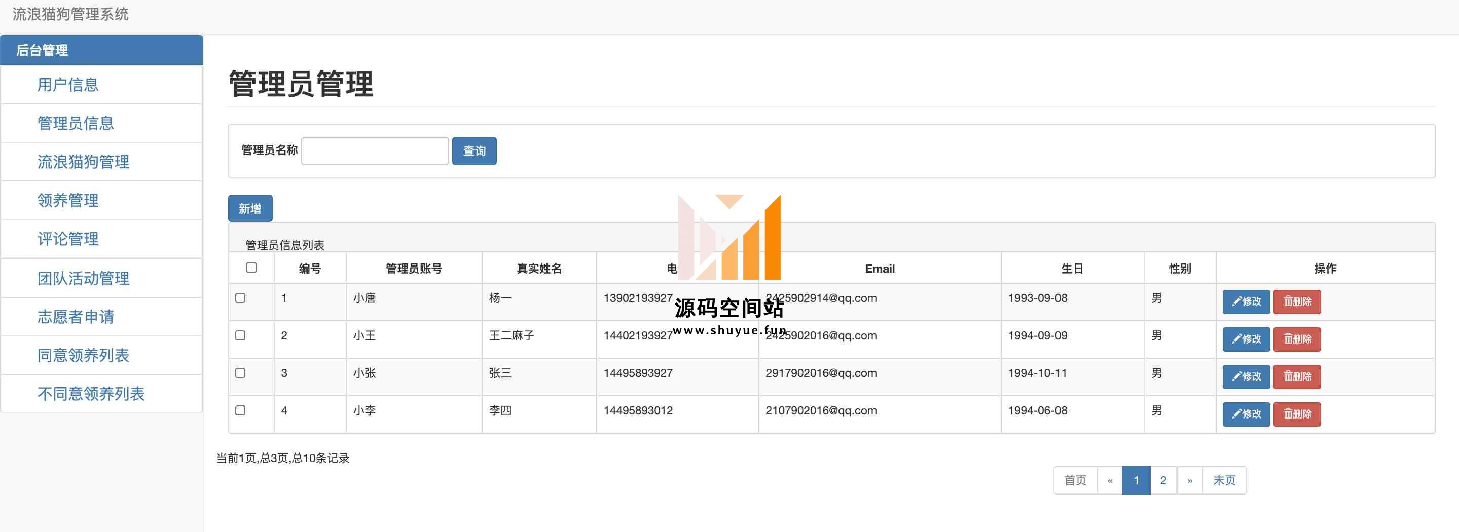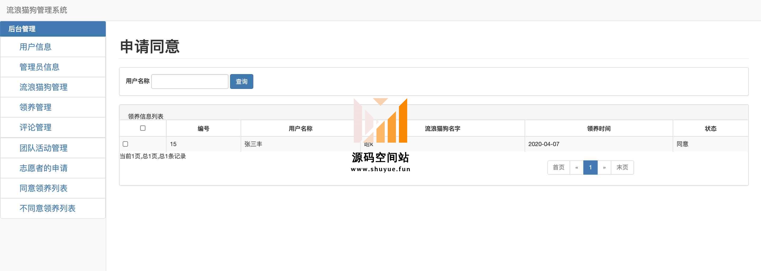 前台主要功能包括:会员的注册登陆,流浪猫狗知识,领养中心,团队活动,流浪宠物详情,申请领养等;后台主要功能包括:管理员的用户信息管理,流浪猫狗信息管理,管理员信息管理,领养管理,评论管理,团队活动管理,志愿者申请信息管理,同意/不同意领养信息列表等
