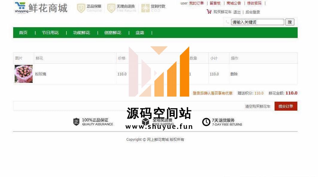 管理员登录,用户管理,鲜花类别管理,鲜花管理,订单管理并发货,留言管理,系统公告管理等功能。用户首页,用户注册登录,查看鲜花详情,加入购物车,确认订单,查看我的订单,商城留言板,商城公告等功能。