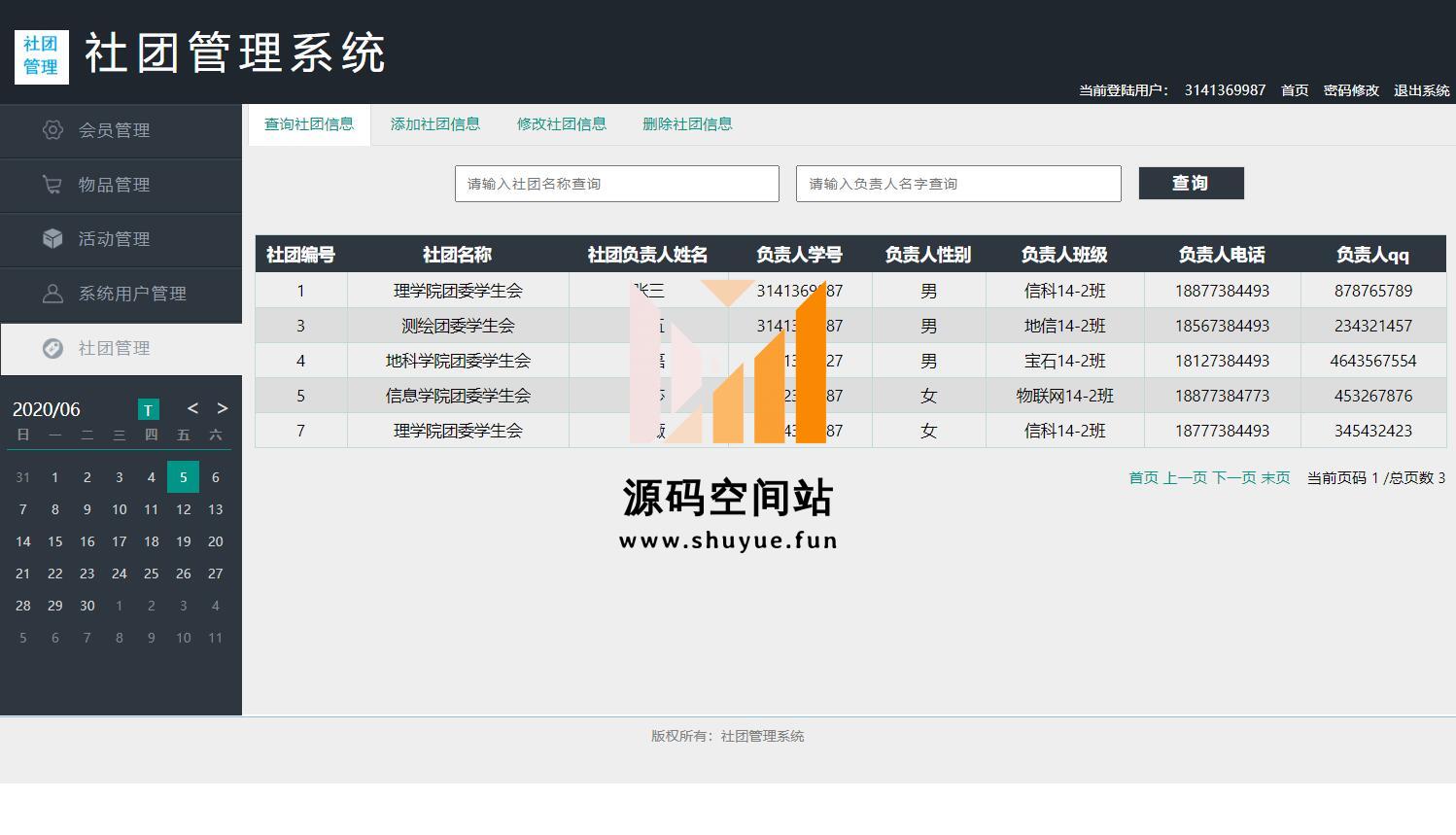 会员管理,物品管理,活动审批,系统用户管理,社团添加删除等功能。更多项目源码,请到“源码空间站”,地址:http://www.shuyue.fun/