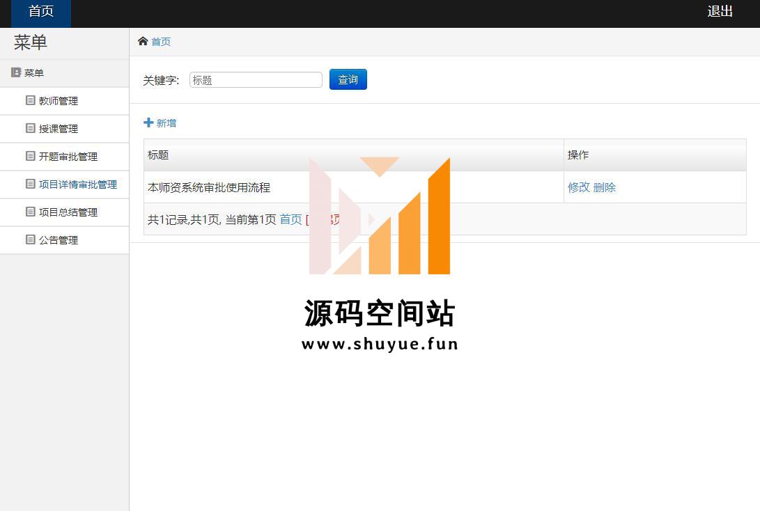 管理员角色登录,教师管理,教师授课管理,审批教师的项目开题,项目详情审批,项目总结审批,公告管理等功能。教师角色登录,修改个人信息,修改密码,公告列表管理,开题审批管理,项目排名,项目详情审批管理,项目总结管理等功能。