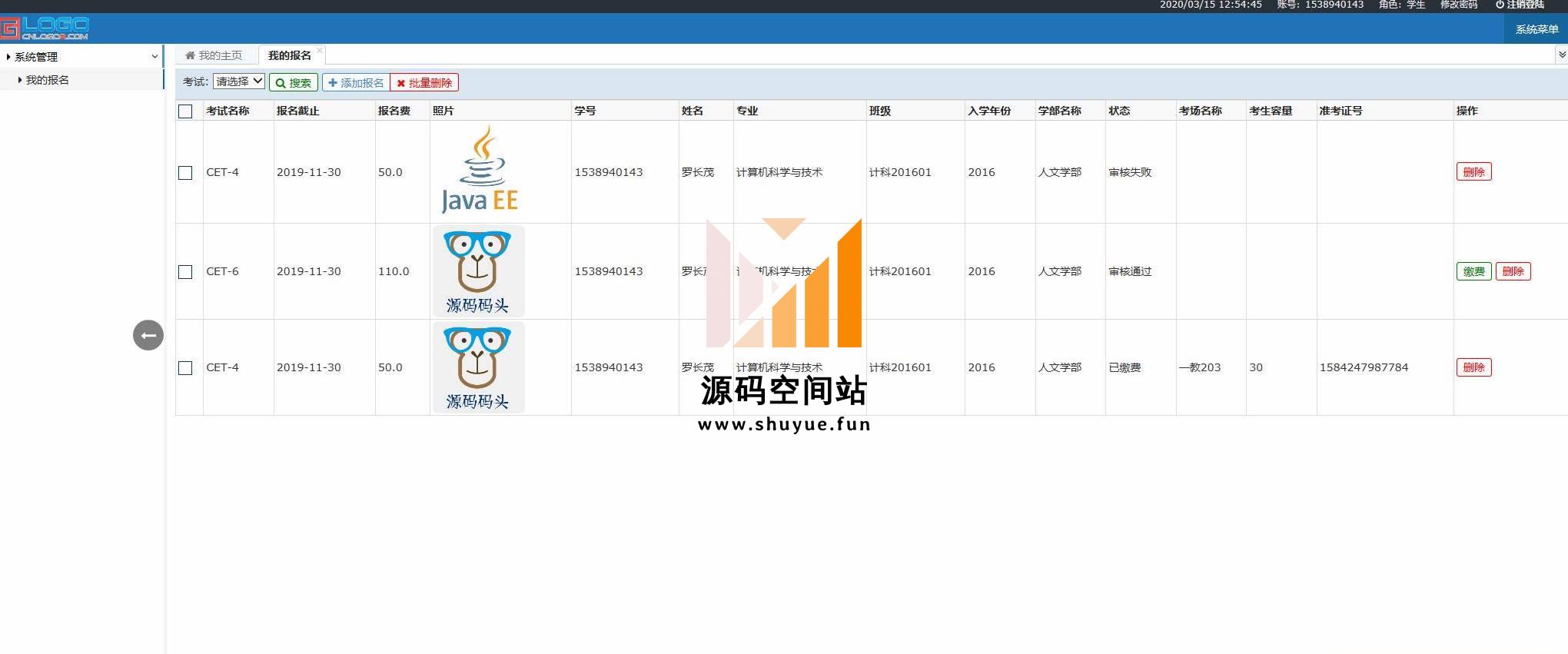 考务管理员登录,教务办公室管理,考场管理,考试管理,考场分配管理,报名管理等功能。更多项目源码,请到“源码空间站”,地址:http://www.shuyue.fun/