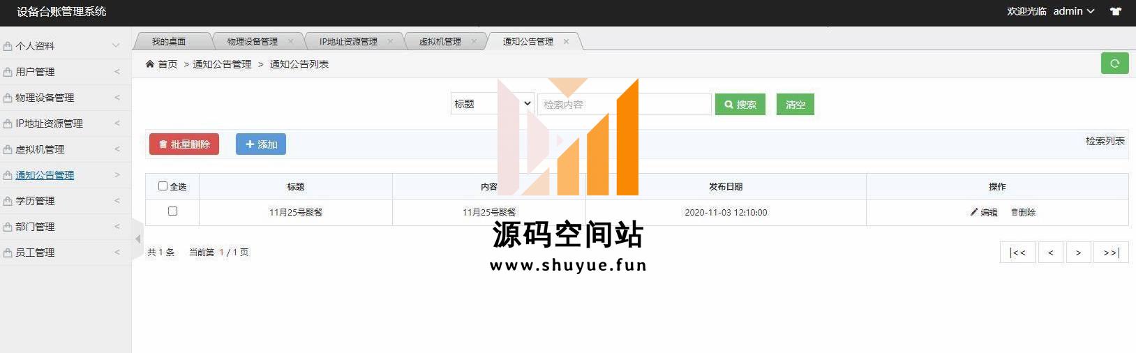 管理员登录,物理设备管理,IP地址资源管理,虚拟机管理,通知公告管理,学历管理,部门管理,员工管理等功能。员工角色登录,查看物理设备,查看IP地址,查看虚拟机,通知公告查看等功能。