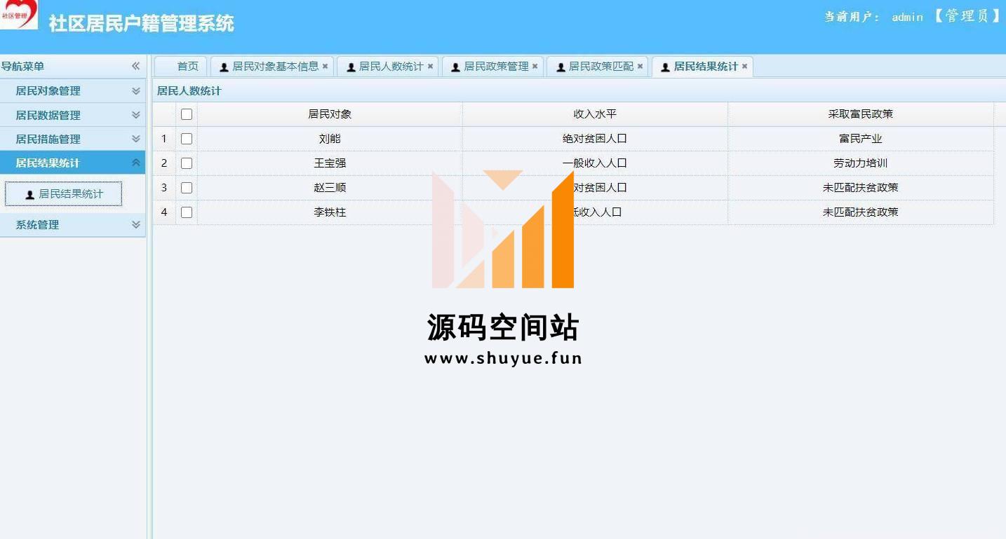 管理员登录,居民信息管理,居民数据统计,居民政策管理,居民措施匹配,居民数据管理,管理员管理等功能。居民登录,基本信息查看等功能。
