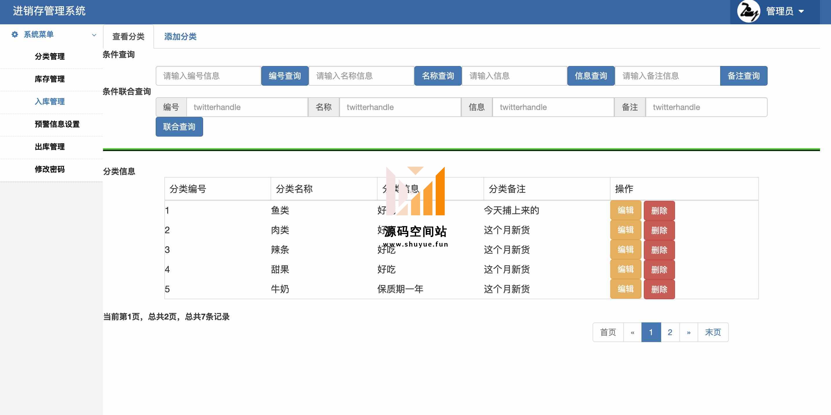 0条评论登录、分类管理、库存管理、入库管理、预警信息设置、出库管理、修改密码等