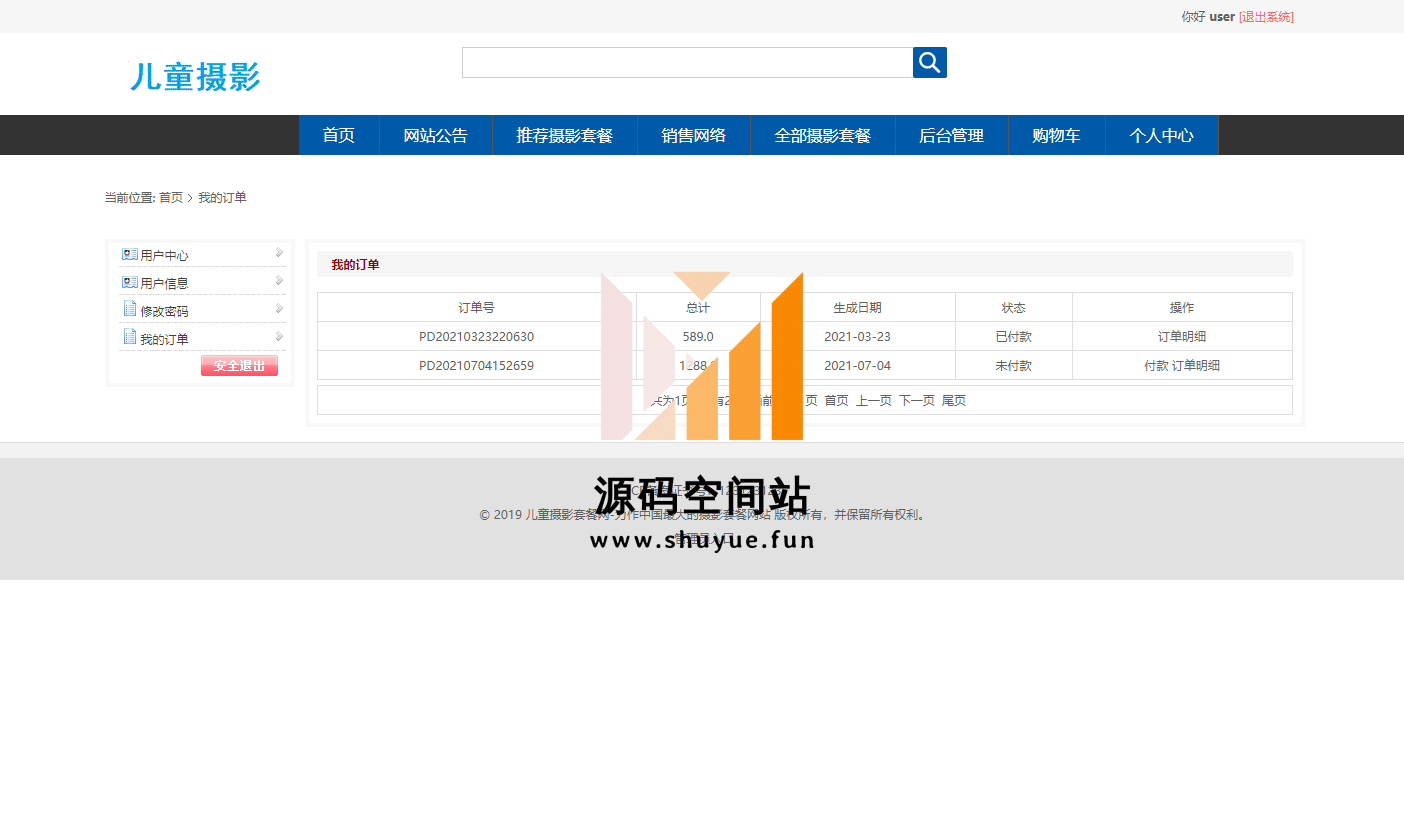 管理员登录,管理员信息管理,用户信息管理,新闻公告管理,套餐类型信息管理,城市信息管理,摄影基地信息管理,套餐信息管理,订单信息管理,查看评价信息等功能。按分类查看,用户登录,查看商品详情,加入购物车,提交订单,查看订单,修改个人信息,查看网站公告,查看摄影基地等功能。