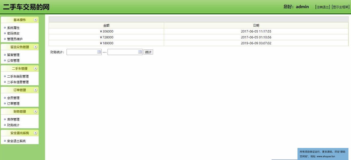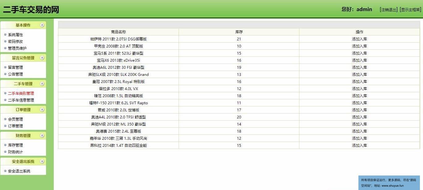 管理员登录,修改密码,管理员管理,留言管理,管理公告,二手车类别管理,二手车信息管理,会员管理,订单管理,库存管理,财务统计等功能。