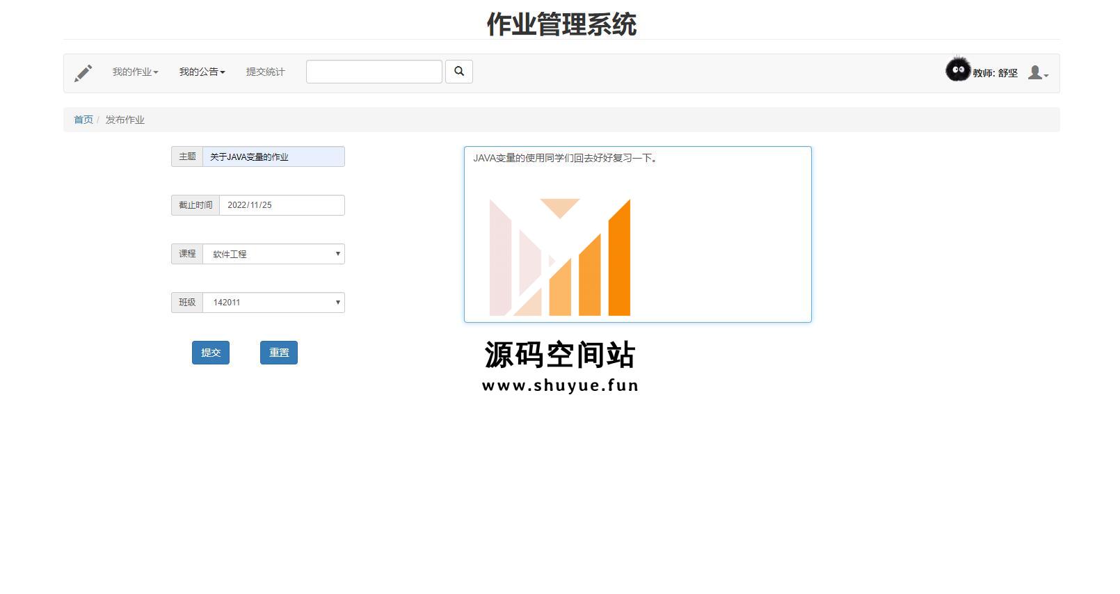 学生角色登陆,作业一览,上传作业,查看作业批阅等功能。更多项目源码,请到“源码空间站”,地址:http://www.shuyue.fun/