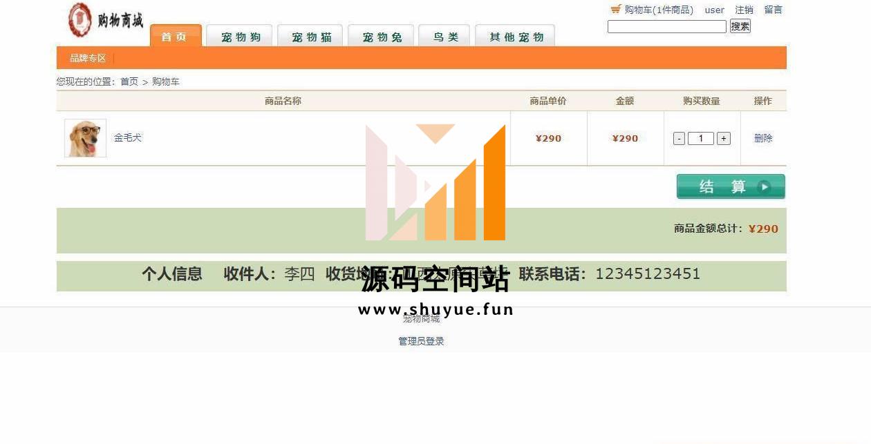 管理员登录,用户管理,管理商品,商品分类管理,订单管理,留言管理,公告管理,新闻管理等功能。更多项目源码,请到“源码空间站”,地址:http://www.shuyue.fun/