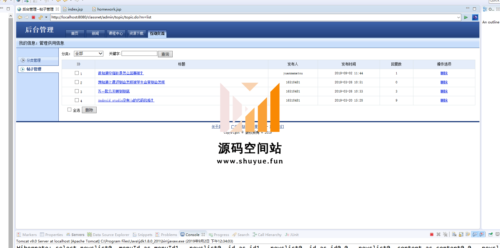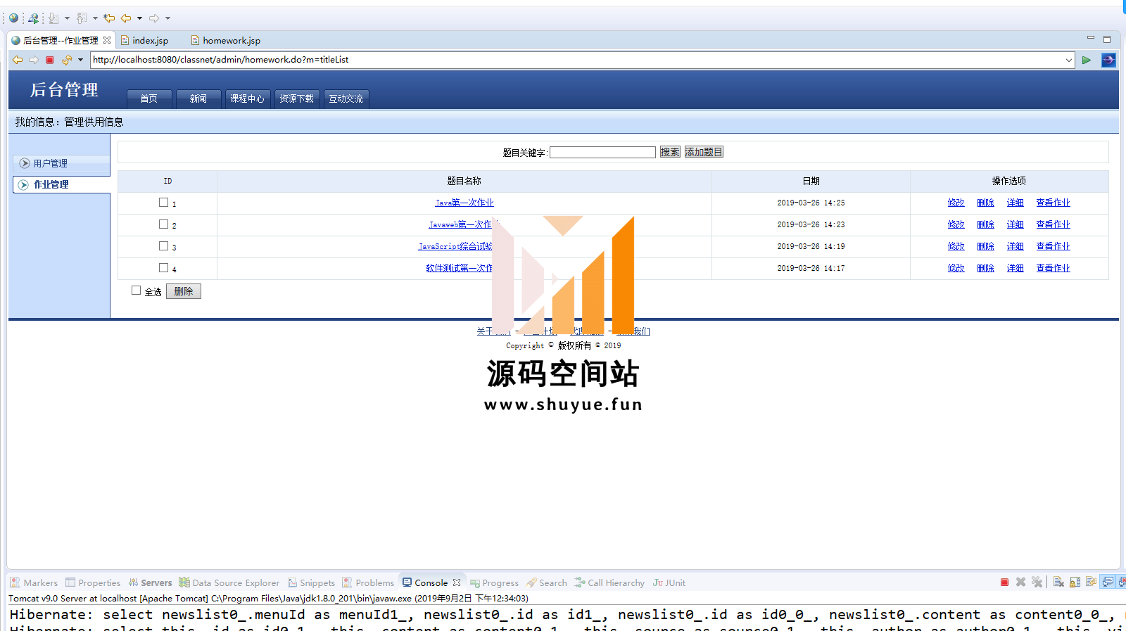 管理员登录,管理员首页,用户管理,作业管理,新闻管理,课程管理,资源管理,互动交流管理等功能。更多项目源码,请到“源码空间站”,地址:http://www.shuyue.fun/