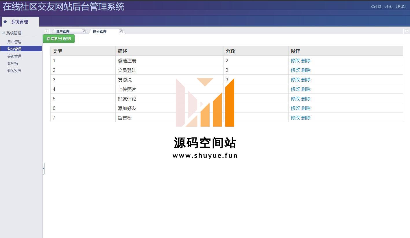 管理员登录,用户管理,积分管理,等级管理,意见箱管理,新闻发布管理等功能。更多项目源码,请到“源码空间站”,地址:http://www.shuyue.fun/