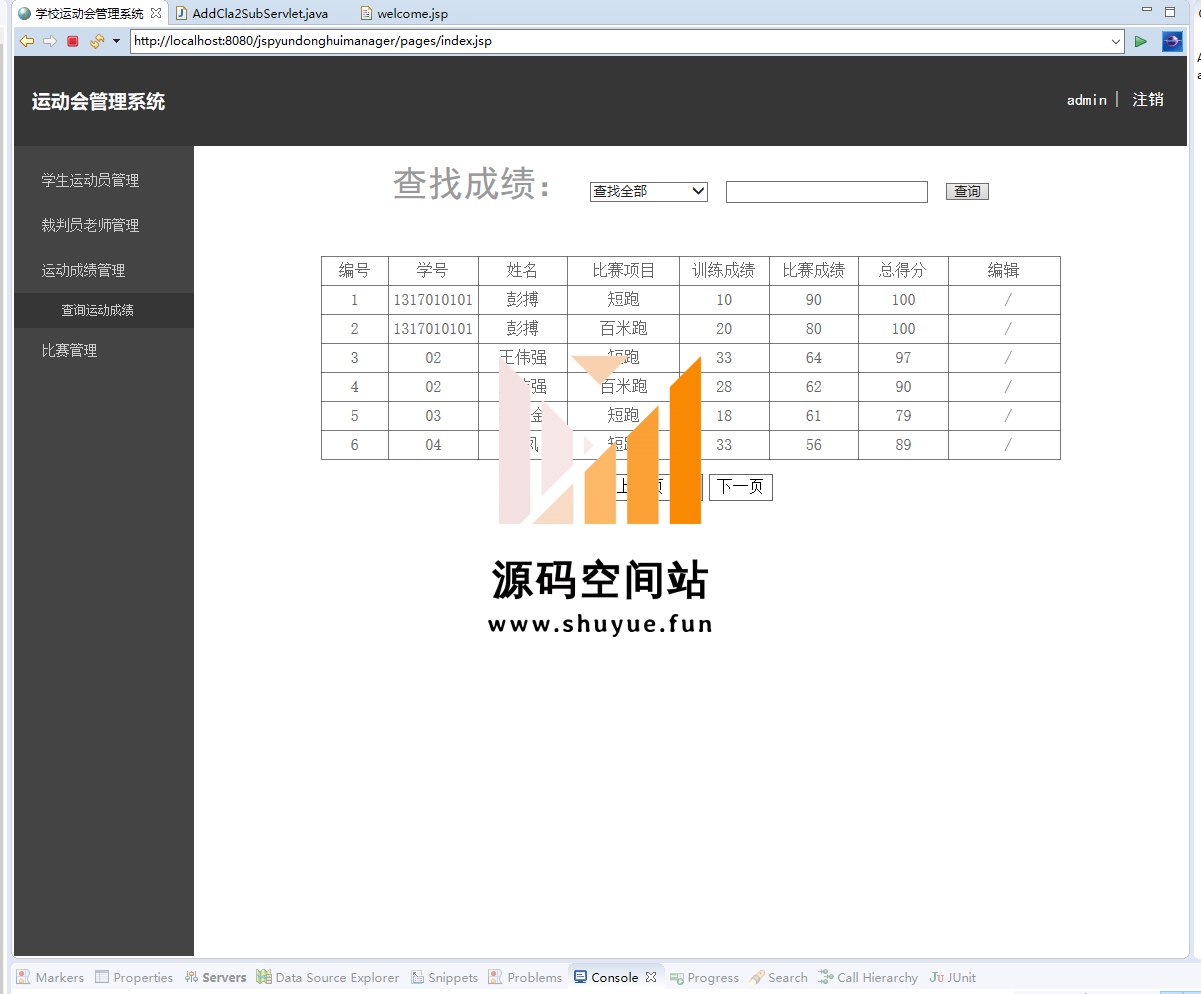运动员登录,个人信息修改,运动成绩查询,比赛项目查询等功能。更多项目源码,请到“源码空间站”,地址:http://www.shuyue.fun/