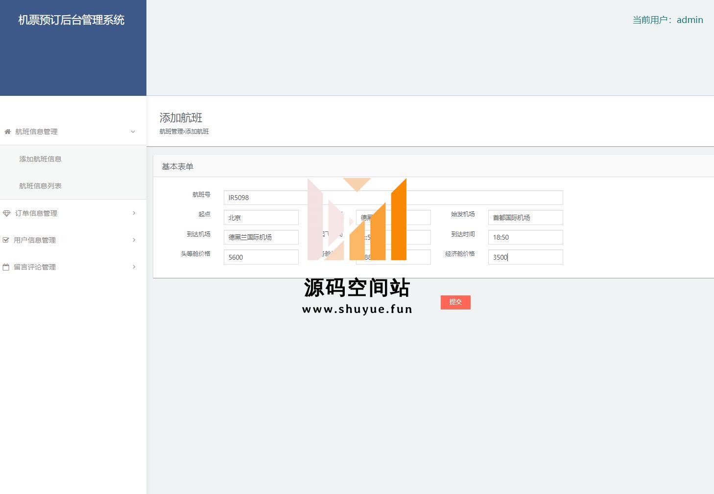 管理员登录,添加航班,航班列表,查看订单,查看用户信息,留言管理等功能。更多项目源码,请到“源码空间站”,地址:http://www.shuyue.fun/