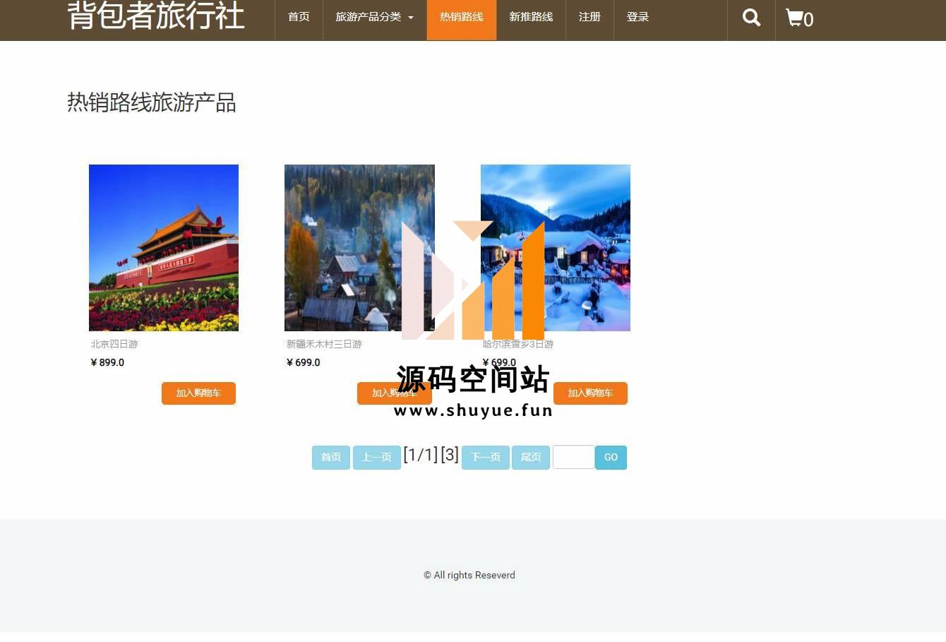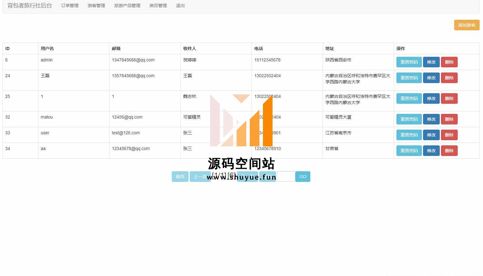 管理员登录,订单管理,游客管理,旅游路线管理,类目管理,旅游产品管理等功能。更多项目源码,请到“源码空间站”,地址:http://www.shuyue.fun/