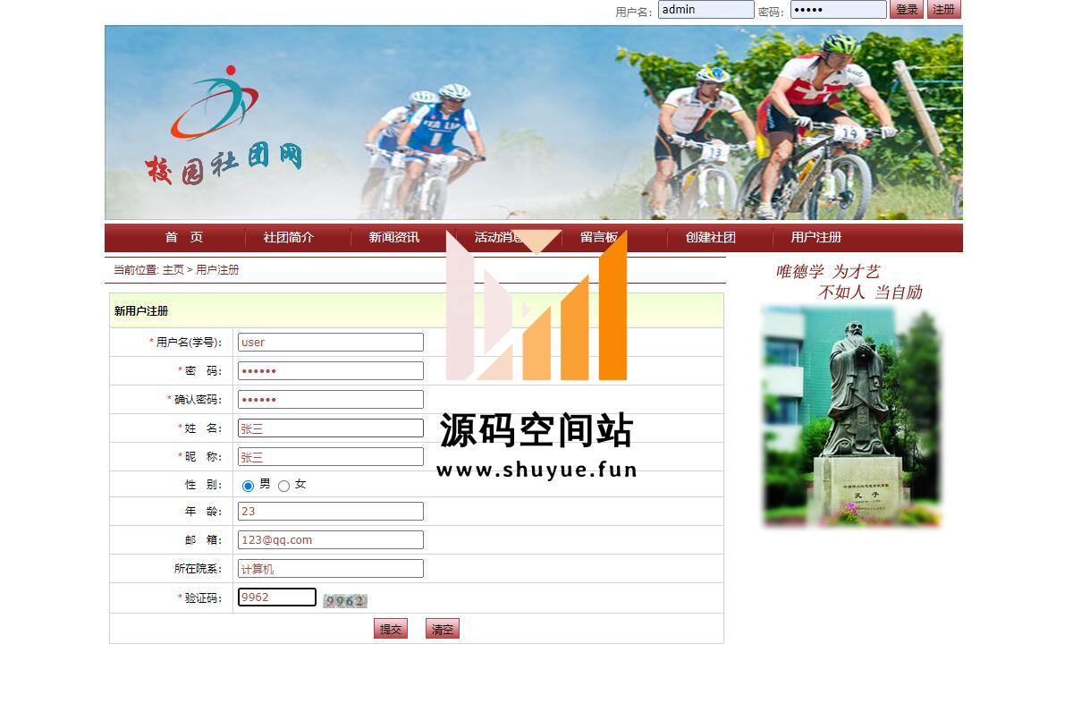 管理员登录,用户信息管理,社团创建审批,社团简介管理,学校器材管理,图片资讯查询,活动消息管理,新闻资讯管理,留言信息查询等功能。更多项目源码,请到“源码空间站”,地址:http://www.shuyue.fun/