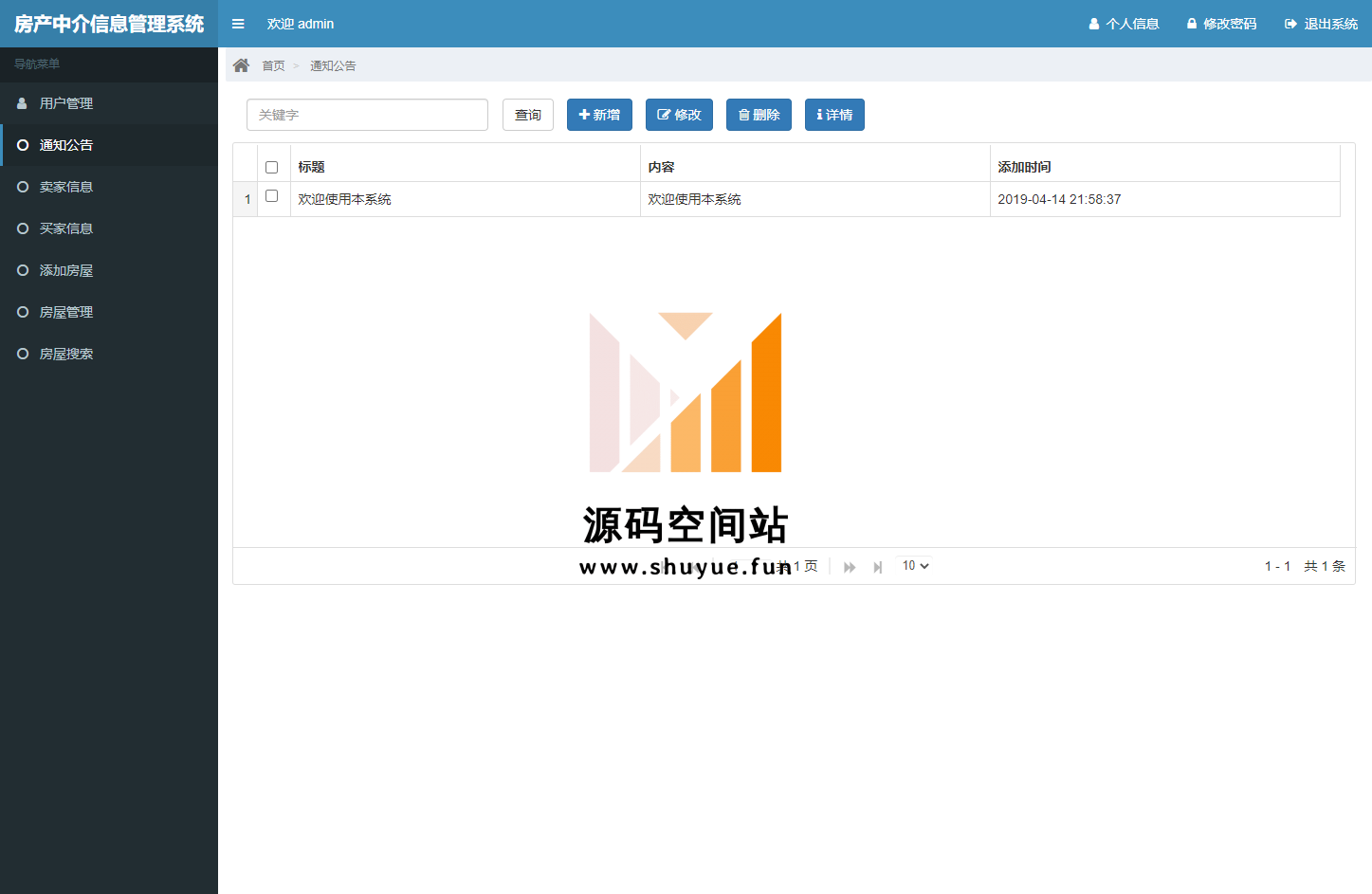 管理员登录,用户管理,通知公告管理,卖家信息管理,买家信息管理,添加房屋,房屋管理,房屋搜索,修改个人信息,修改密码等功能。管理员账号/密码:admin/admin