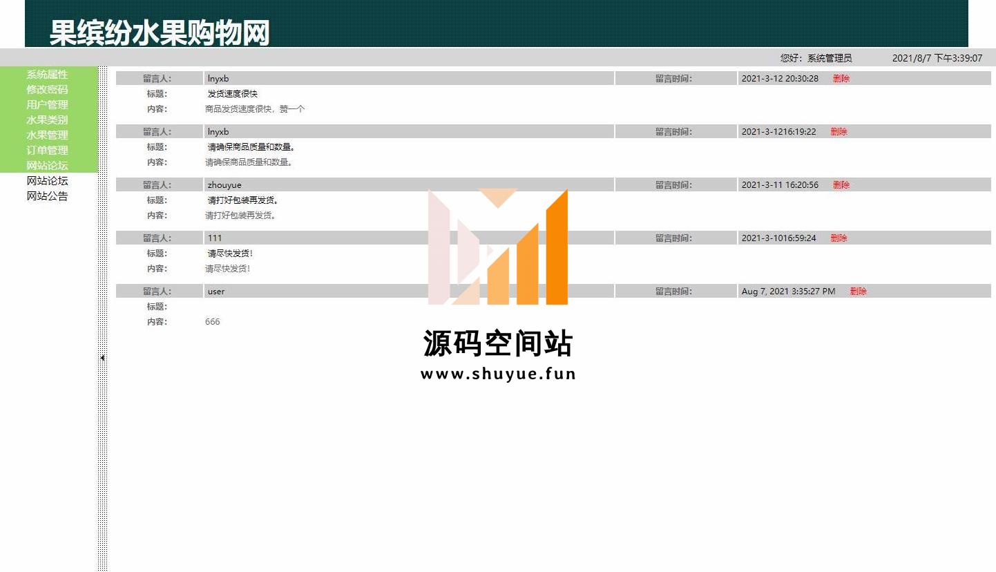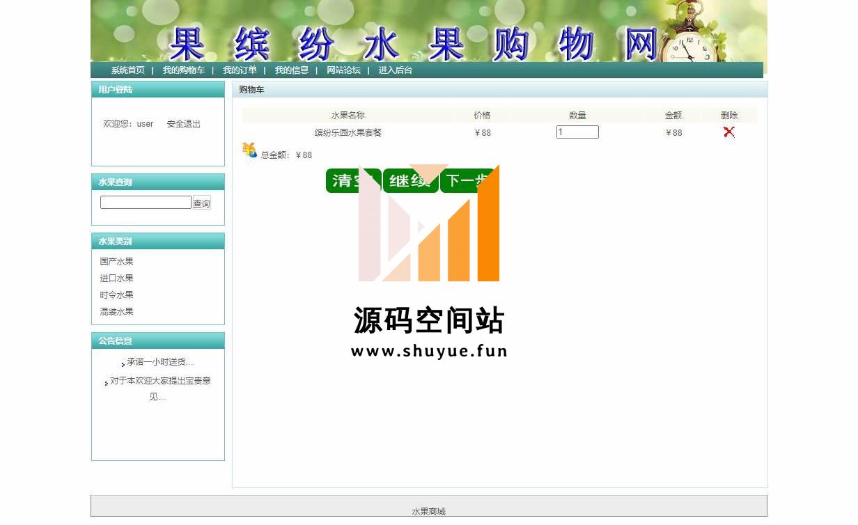 管理员登录,修改密码,类别管理,水果管理,订单管理,网站论坛管理,网站公告管理等功能。查看首页,查看水果详情,加入购物车,提交订单,修改个人信息,查看并提交留言,查看我的订单等功能。