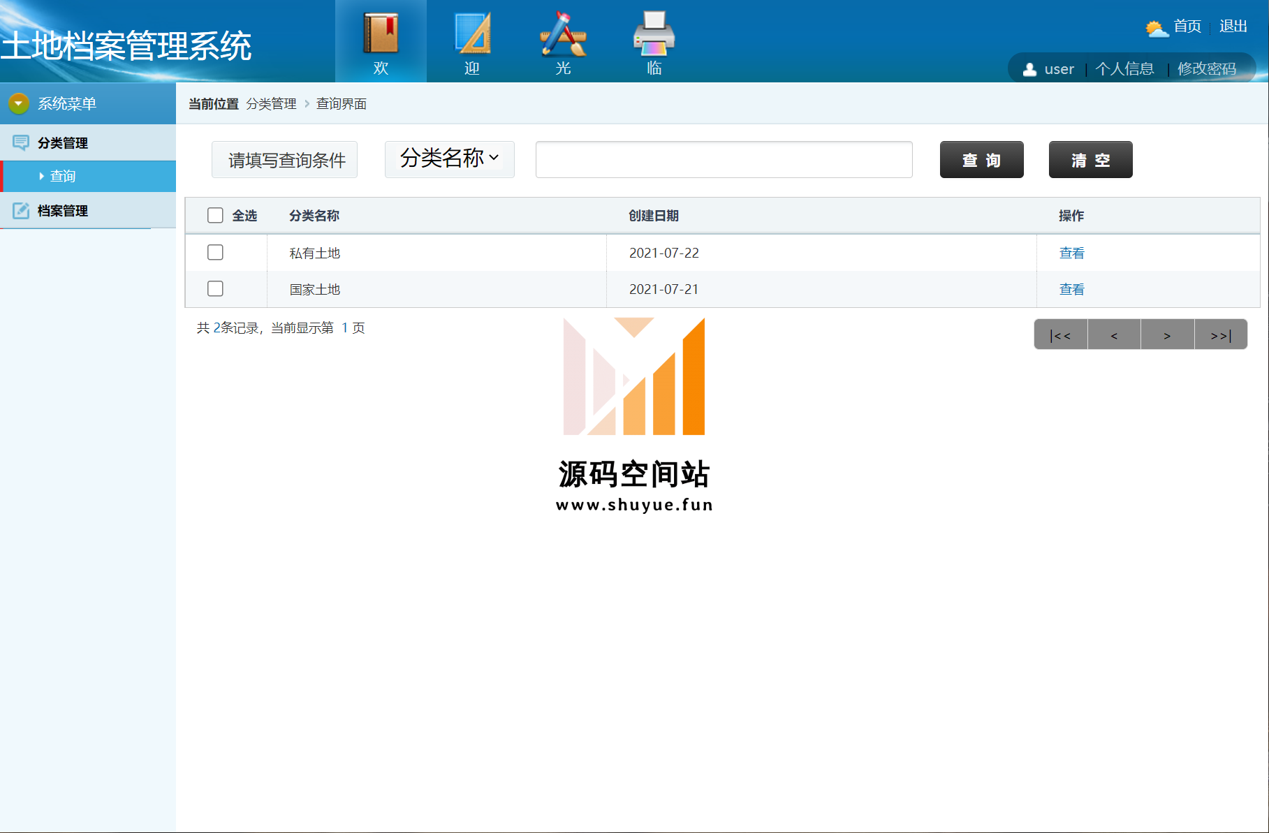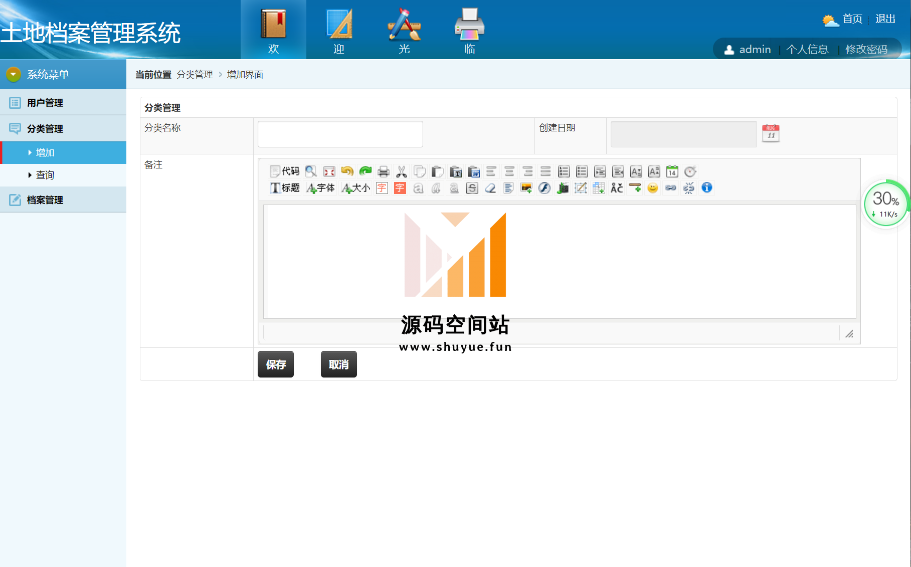 管理员登录,用户管理,分类管理,档案管理等功能。演示视频:点此查看