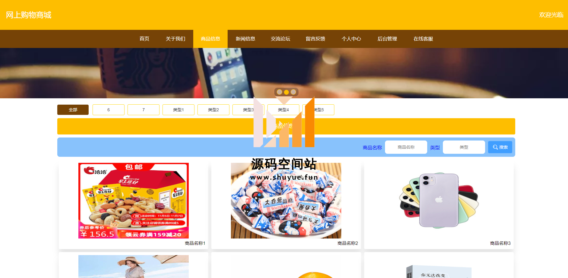 前台用户可以实现商品浏览在 ,系统首页可以查看首页,商品信息,求购信息,留言板,个人中心,后台管理,购物车,在线客服等